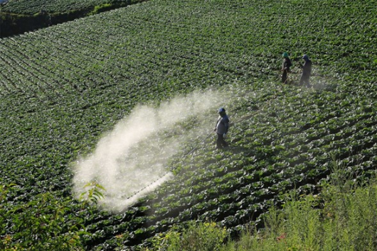 Foto: Agricultores rociando plaguicidas en un campo de coles en las tierras altas de Anbandagi, Corea del Sur (Foto: Shutterstock.com)