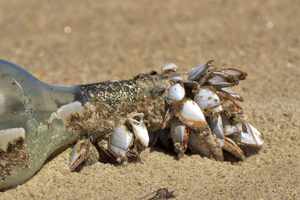 ¿Cómo incide el tamaño de los residuos en esta colonización por parte de los epibiontes? Quien haya mirado la basura plástica de una playa con atención seguro recuerda haber visto una botella con balanos, unos crustáceos cónicos que parecen un volcán en miniatura, o tal vez con mejillones, moluscos bivalvos negruzcos. Ahora recordar un pedacito de plástico de unos pocos centímetros colonizado por balanos o mejillones ya no es tan frecuente.