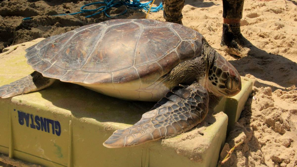 Tortuga verde afectada por plásticos en muestreo de la ONG Karumbé, La Coronilla. Foto: Leo Lagos