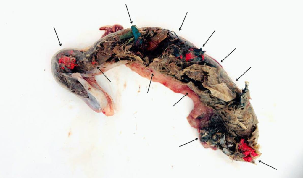 Obstrucción por plásticos en tracto digestivo de tortuga fallecida. Foto: Daniel González Paredes