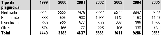 en toneladas de las importaciones de agrotóxicos 1999 - 2005