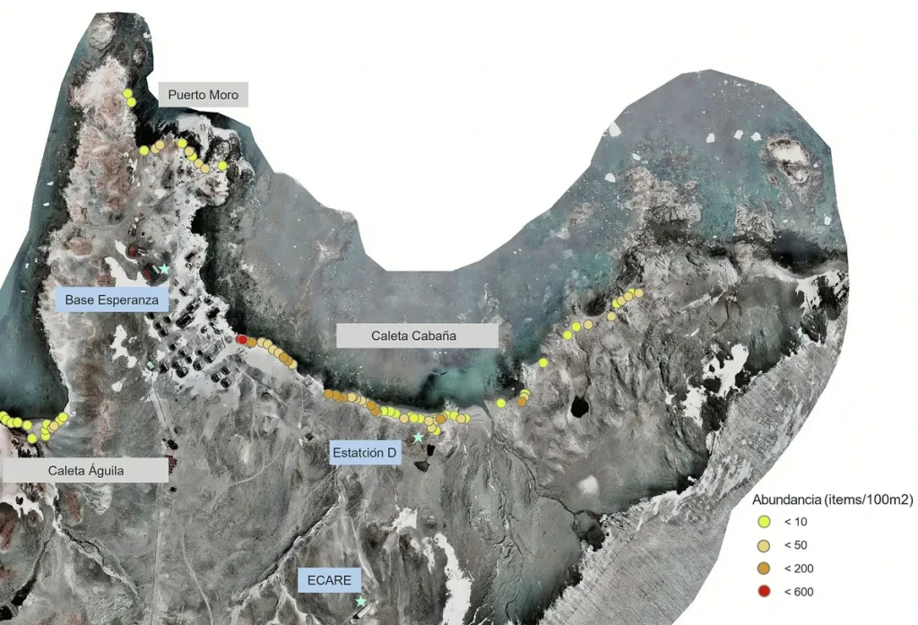 En el artículo reportan haber recolectado “3.477 artículos a lo largo de 2.437 metros de costa, lo que resultó en una abundancia media estimada para bahía Esperanza de 0,29 piezas por m²”. Lo que señalan luego no es muy sorprendente: “La mayor cantidad de artículos se registró cerca de las bases científicas, particularmente en las costas de Caleta Cabaña”.